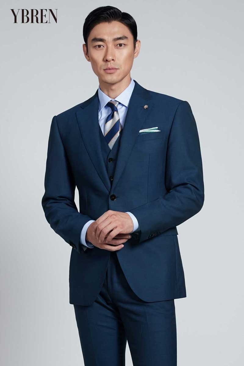 蓝色戗驳领羊毛混纺商务休闲西服三件套 精品