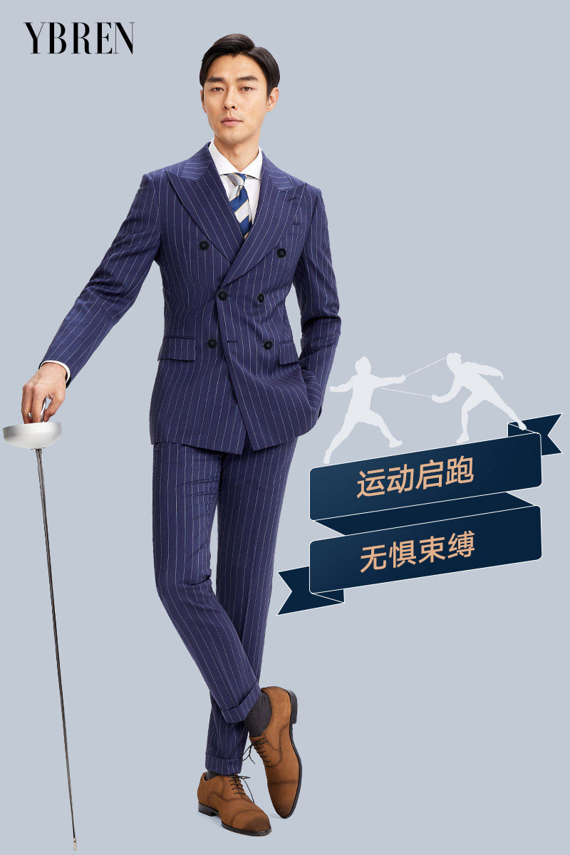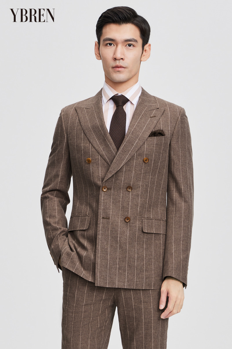 宽条纹戗驳领双排扣羊毛混纺西服二件套 精品