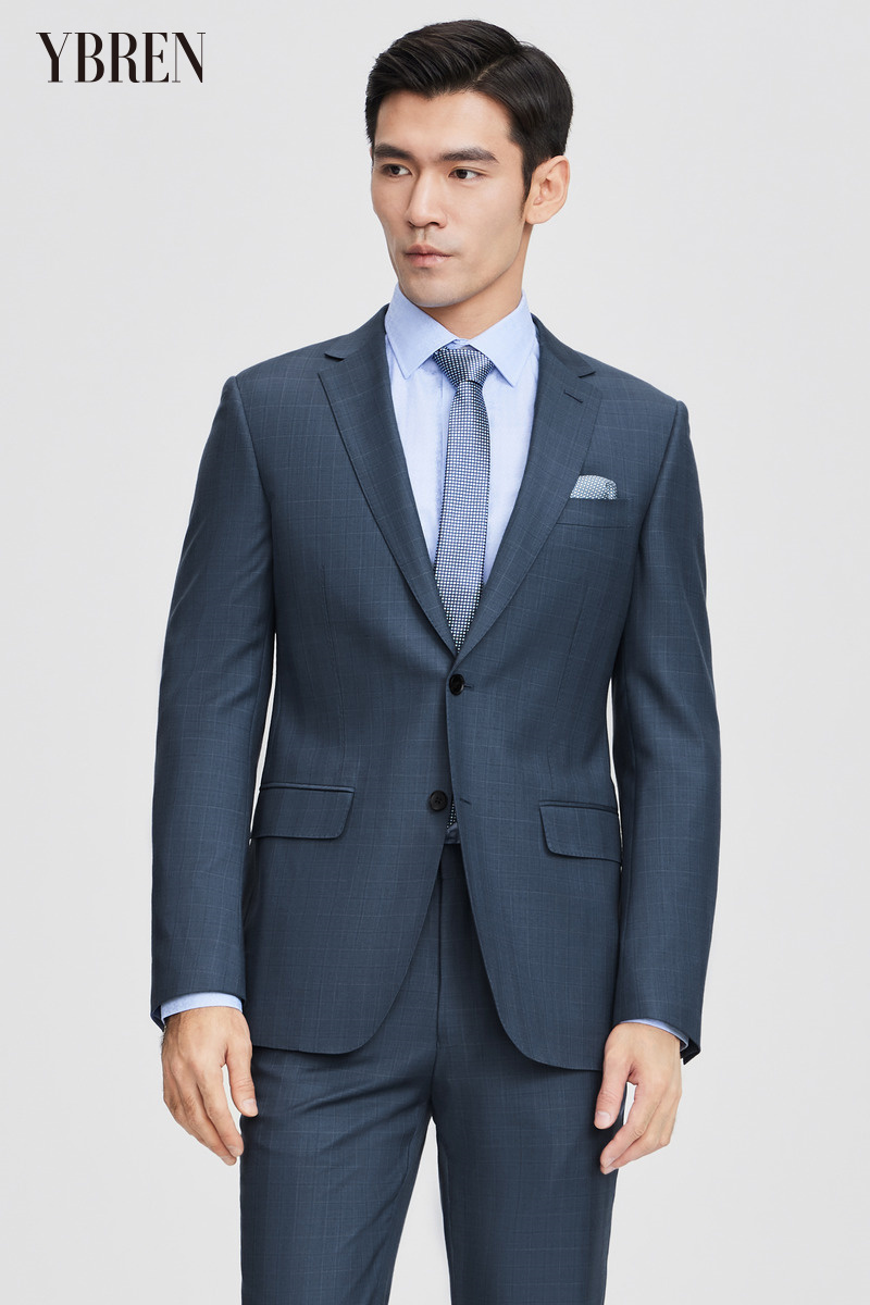 蓝色小格纹平驳领全羊毛商务休闲西服二件套 精品