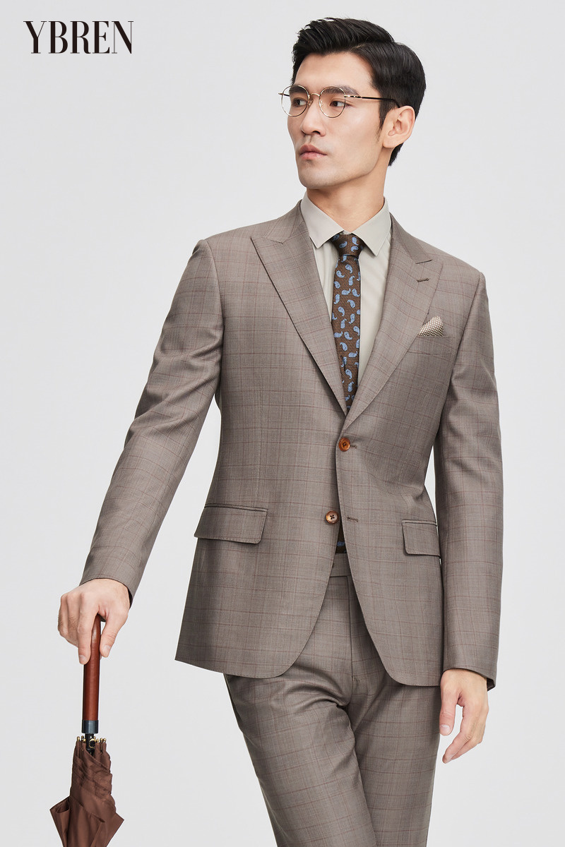 浅黄色大格纹全羊毛经典商务西服两件套 精品