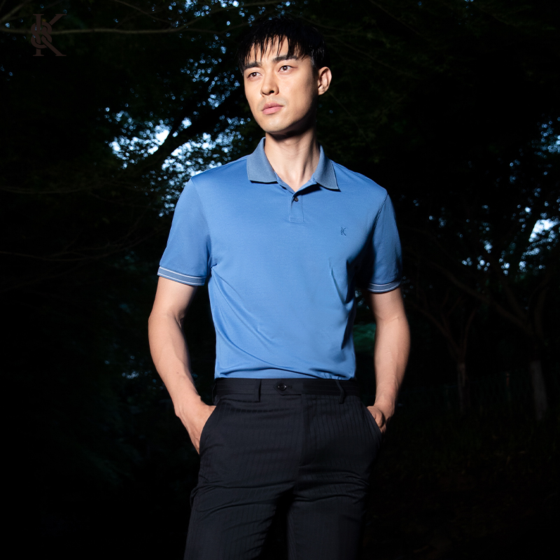 雾霾蓝拼色扁机领弹力速干珠地polo 国产