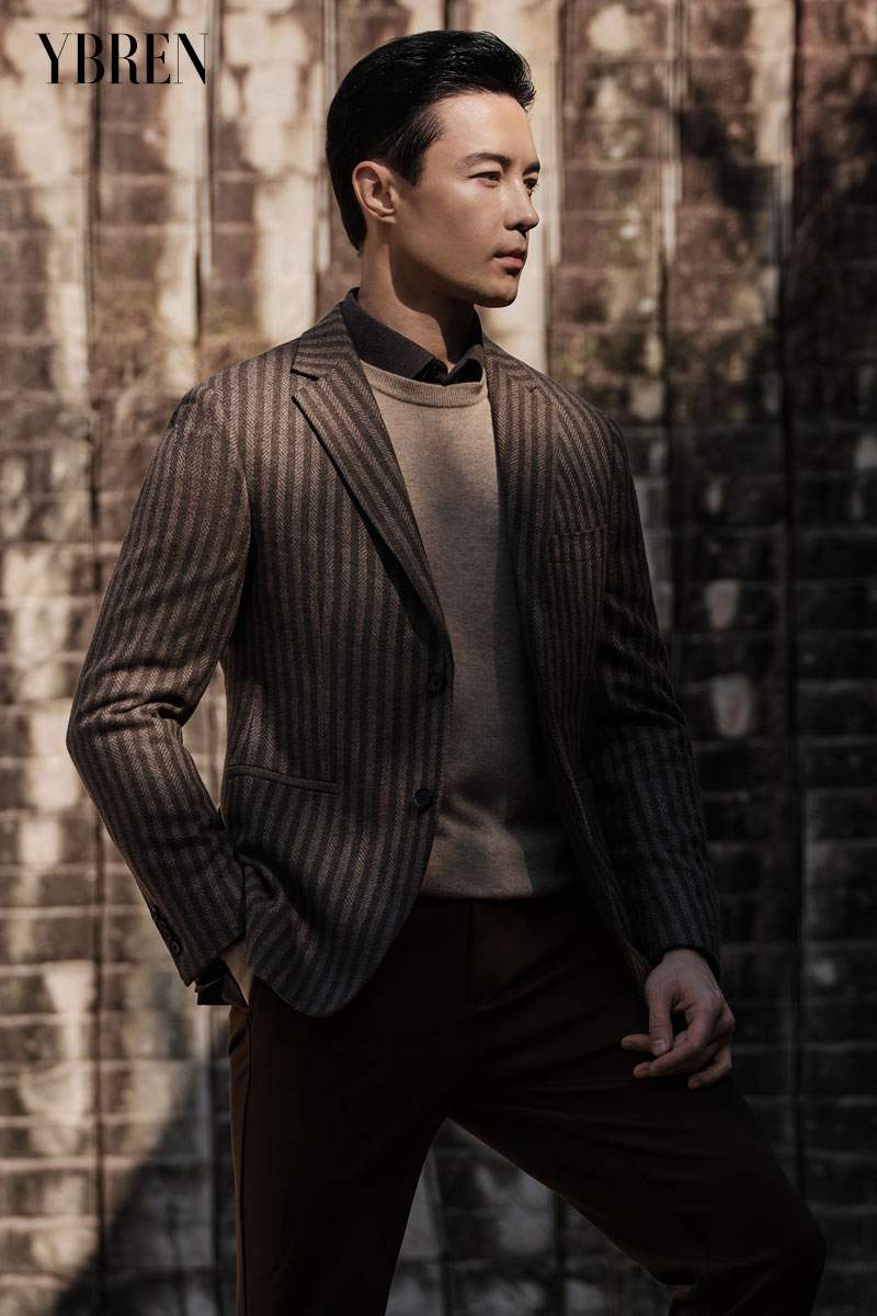 深咖色条纹平驳领羊毛羊绒时尚商务单西 精品
