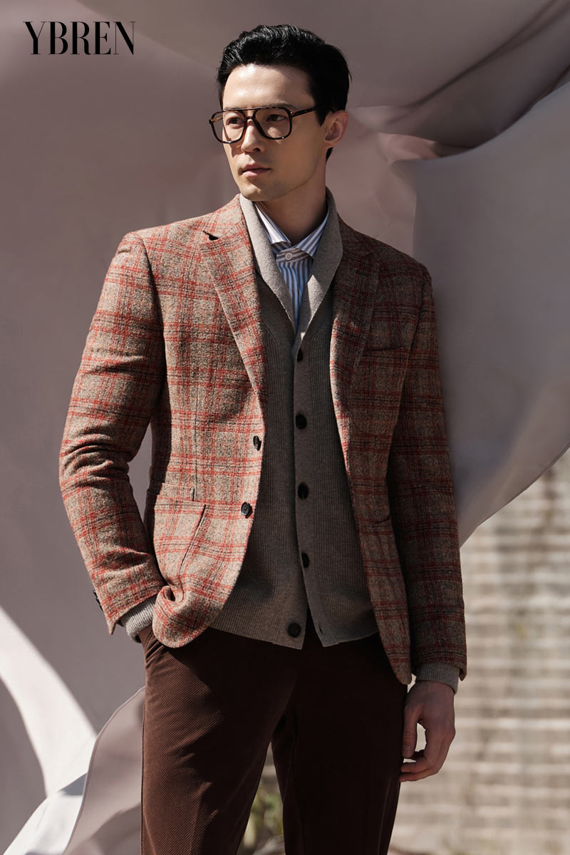 灰褐色格纹平驳领羊毛混纺时尚商务单西 精品