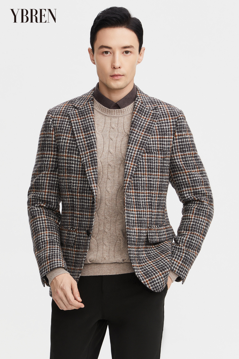 驼色格纹平驳领毛丝商务休闲西装上衣 国产