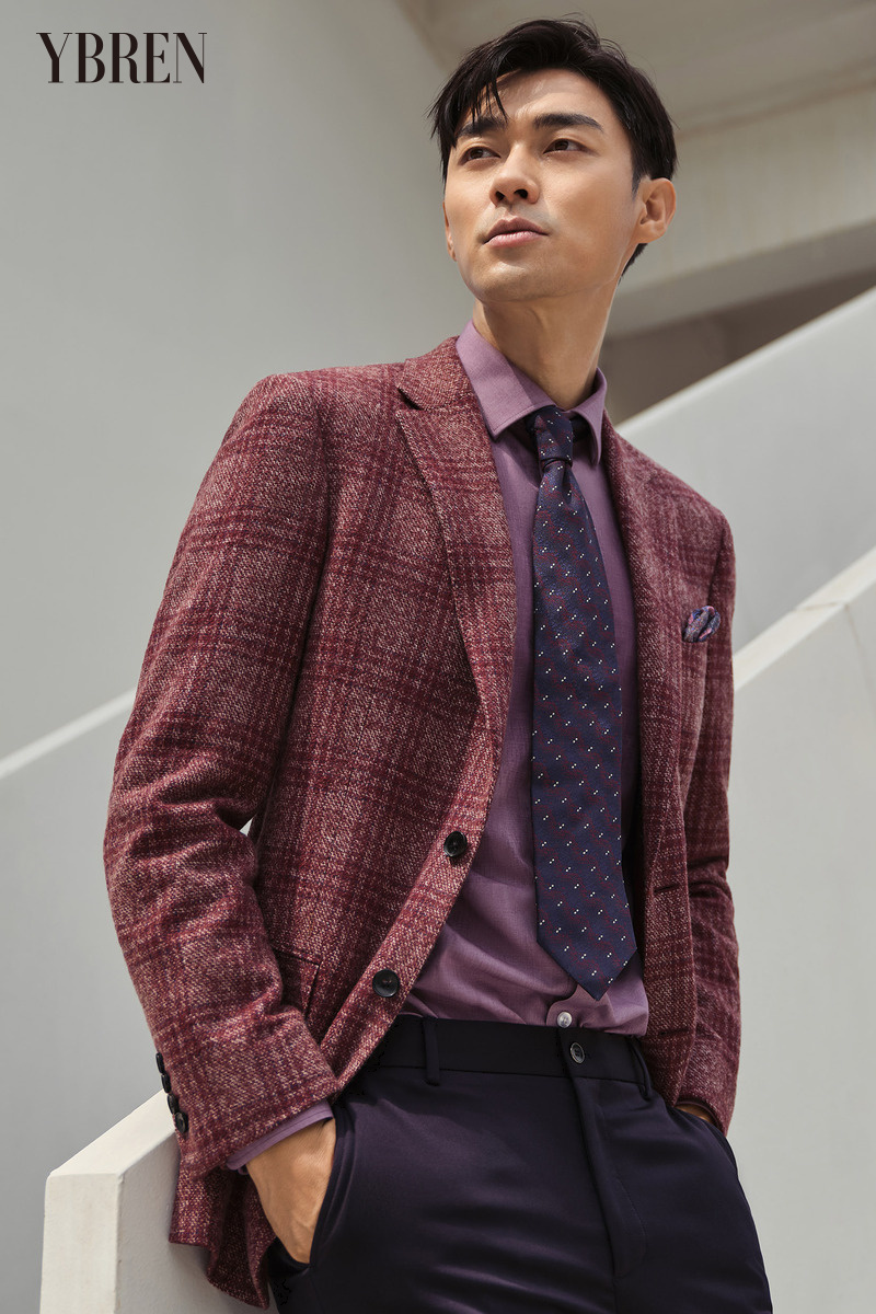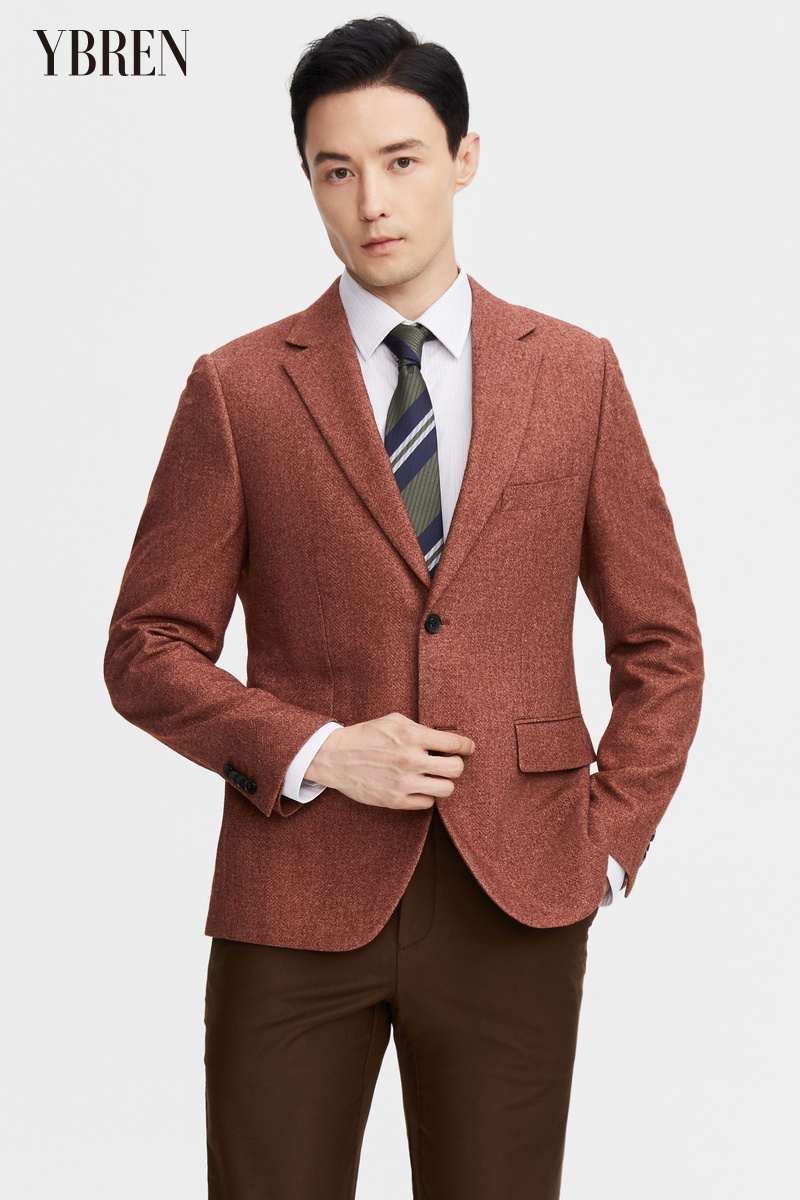 红色人字纹平驳领羊毛混纺时尚商务单西 精品